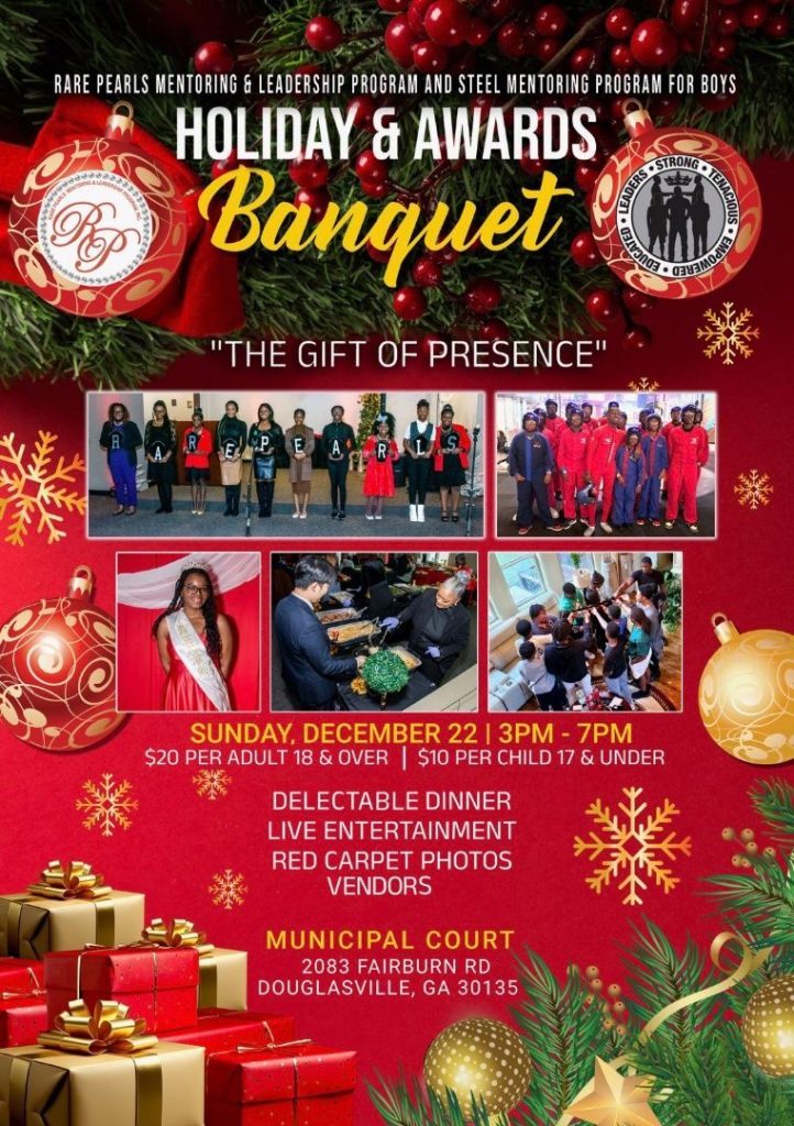 Join us for the Rare Pearls Mentoring & Leadership Program and STEEL Mentoring Program for Boys Holiday & Awards Banquet: “The Gift of Presence”! Celebrate a year of achievements with a delightful evening of community, recognition, and joy.
